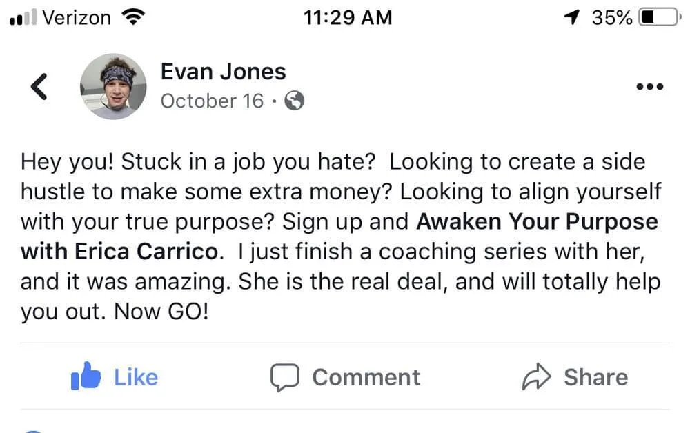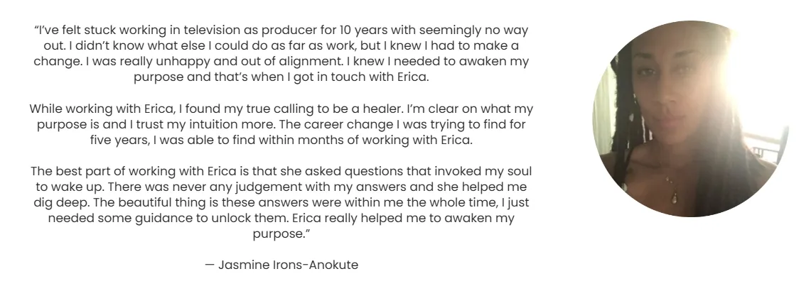 "I’ve felt stuck working in television as producer for 10 years with seemingly no way out. I didn’t know what else I could do as far as work, but I knew I had to make a change. The career change I was trying to find for 5 years, I was able to find within days through Awaken Your Purpose!" — Jasmine