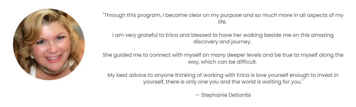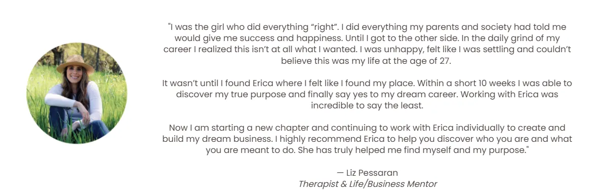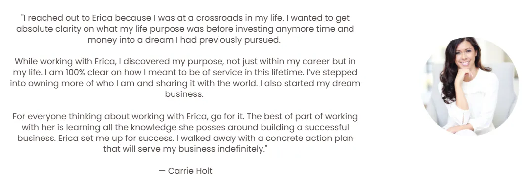 "While working with Erica, I discovered my purpose, not just within my career but in my life. I am 100% clear on how I meant to be of service in this lifetime. I’ve stepped into owning more of who I am and sharing it with the world. I also started my dream business." — Carrie H.