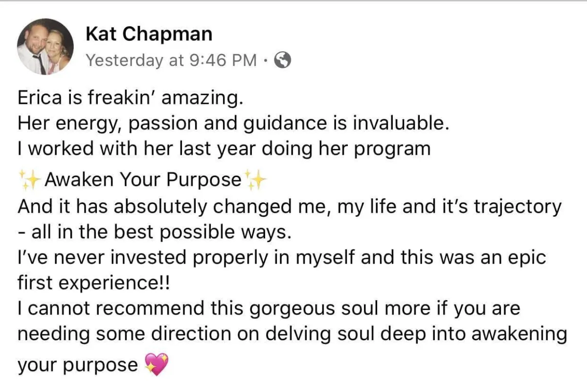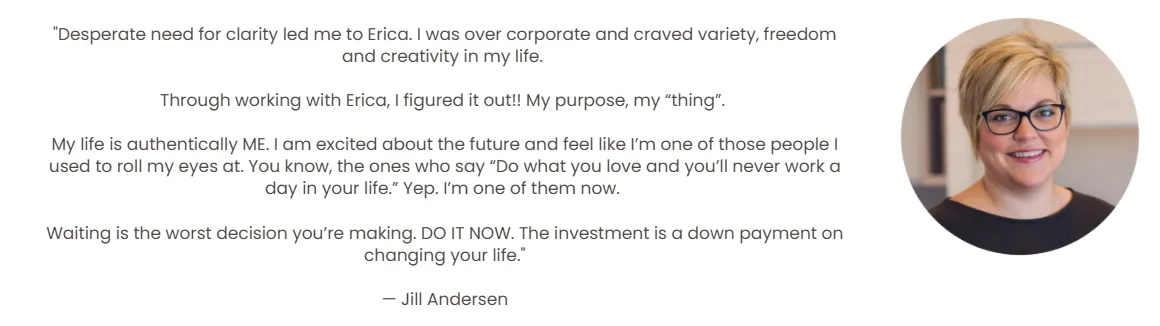 "Desperate need for clarity led me to Erica. I was over corporate and craved variety, freedom and creativity in my life. Through Awaken Your Purpose, I figured it out!! My purpose, my 'thing'." — Jill A.