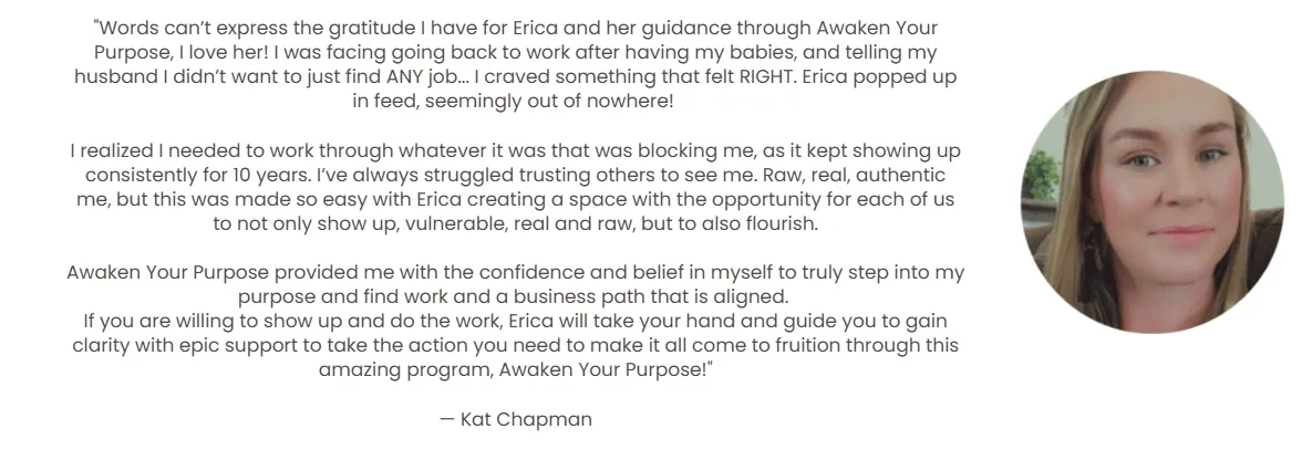 "I was facing going back to work after having my babies, and telling my husband I didn’t want to just find ANY job... I craved something that felt RIGHT. Awaken Your Purpose provided me with the confidence and belief in myself to truly step into my purpose and find work and a business path that is aligned." — Kat C.