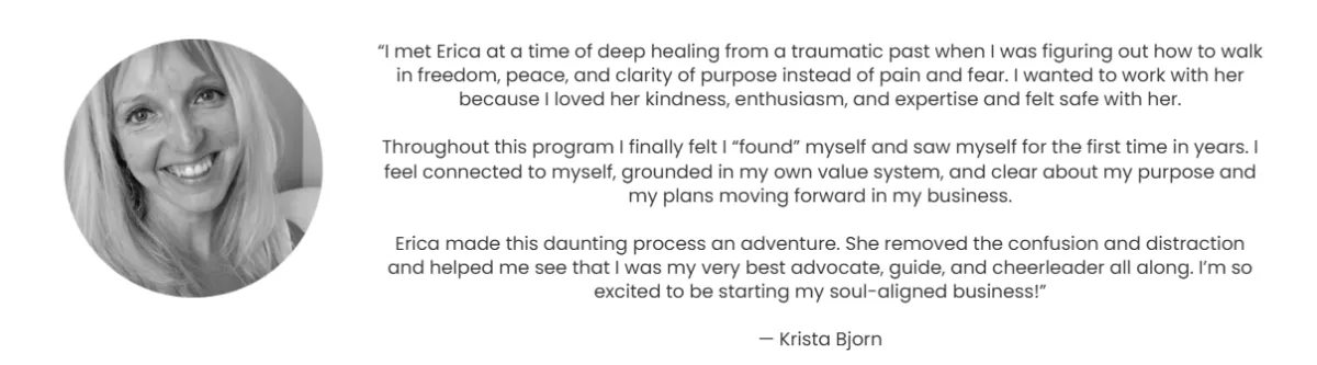 "Throughout this process I finally felt I 'found' myself and saw myself for the first time in years. I feel connected to myself, grounded in my own value system, and clear about my purpose and my plans moving forward in my business." — Krista